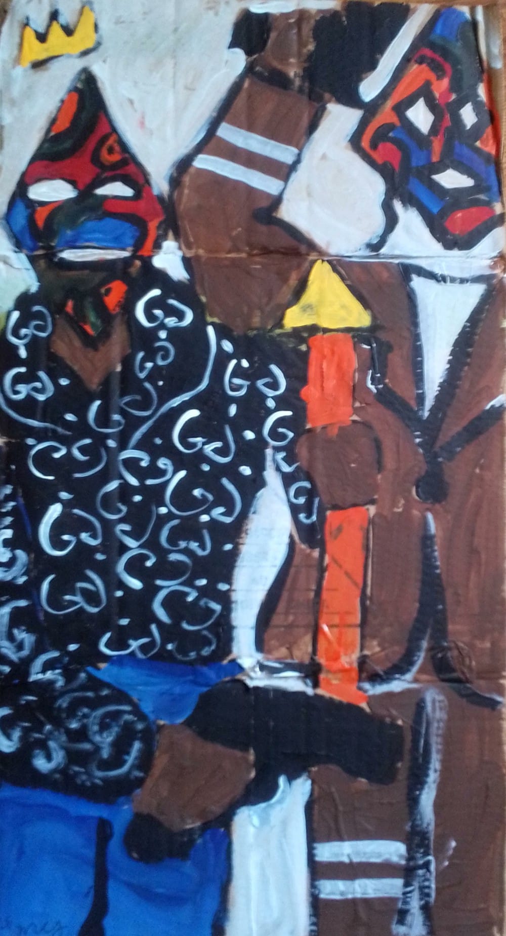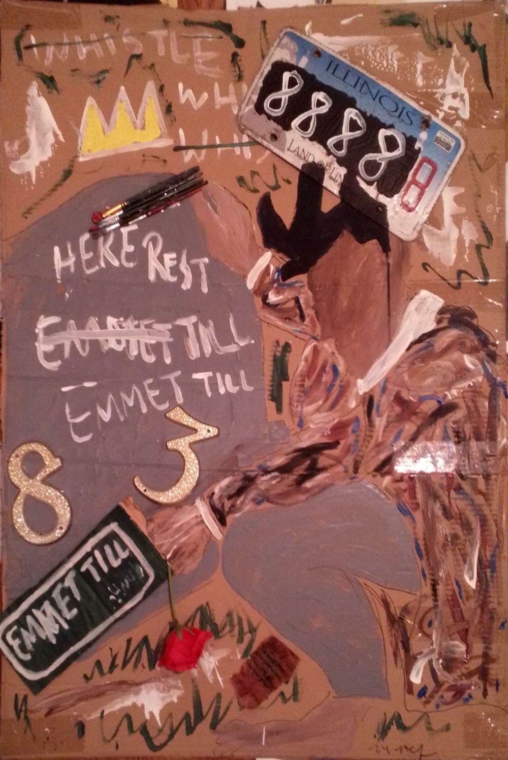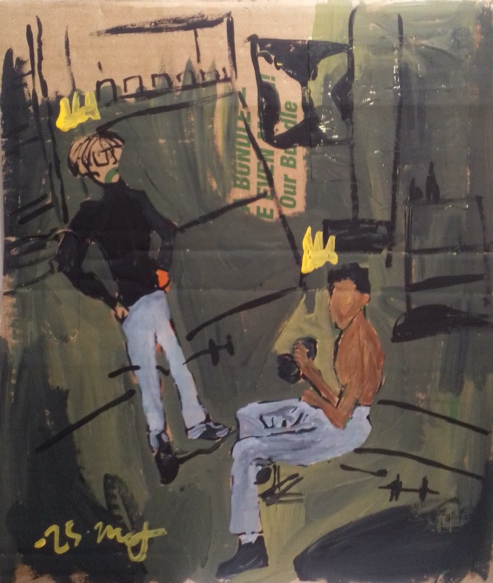 New works are being offered including "Art vs Life," shown above: "A depiction of what creating feels like while simultaneously living feeling life. Painstakingly painted on a U-Haul cardboard to further grieve the loss of my second life's collection."