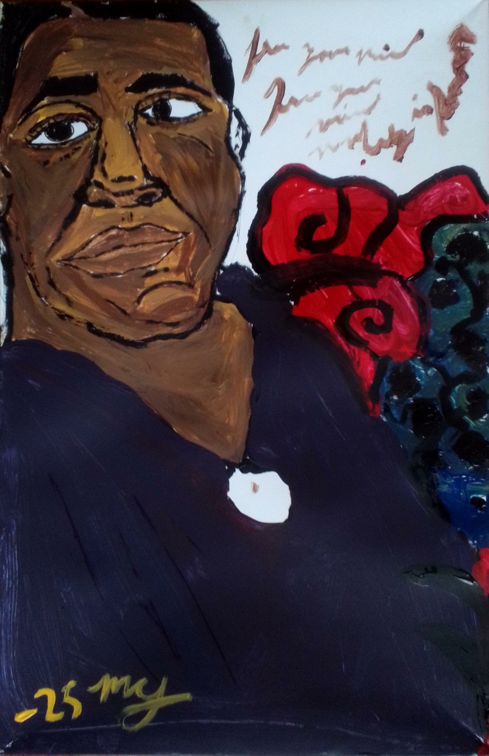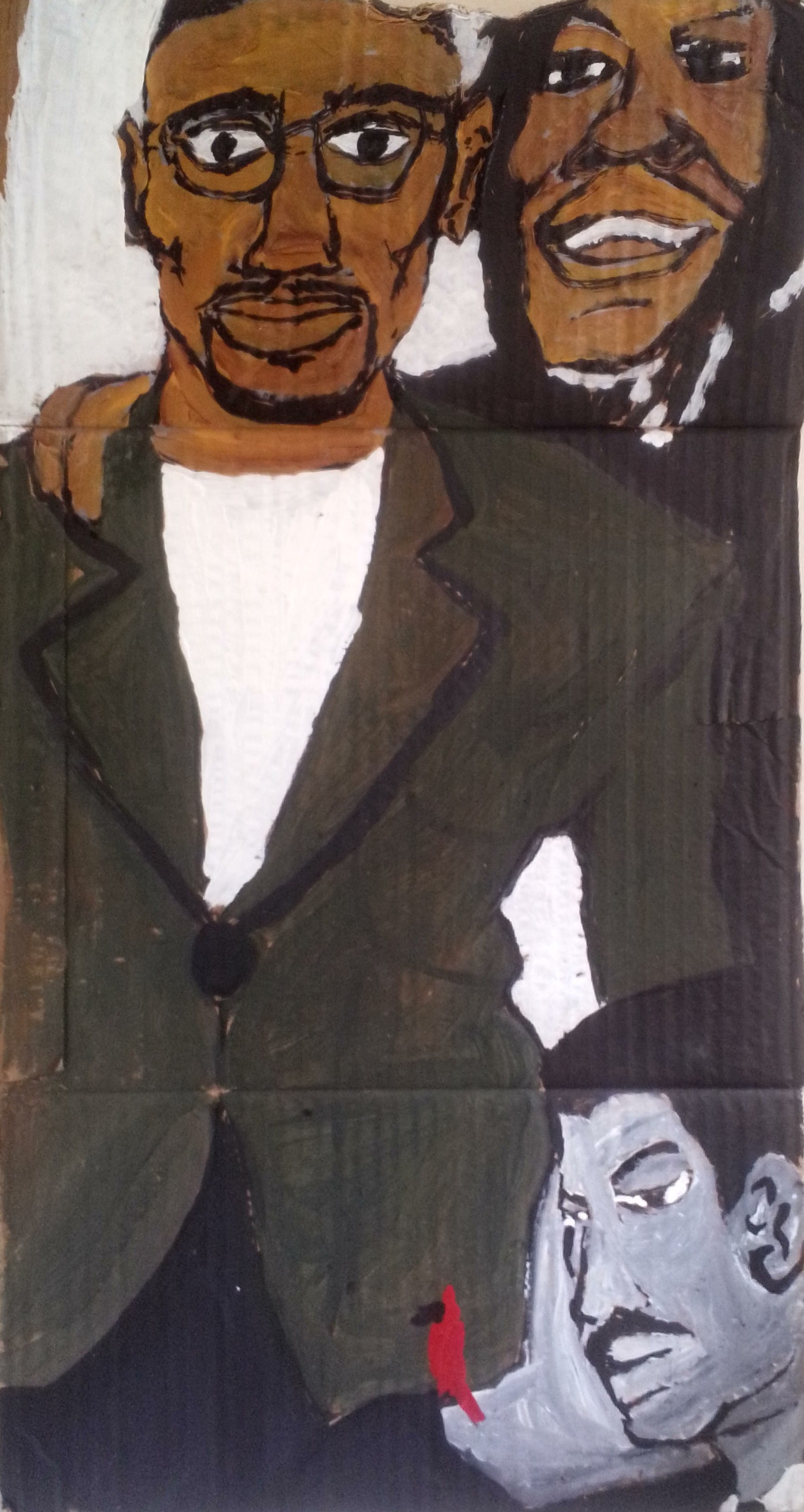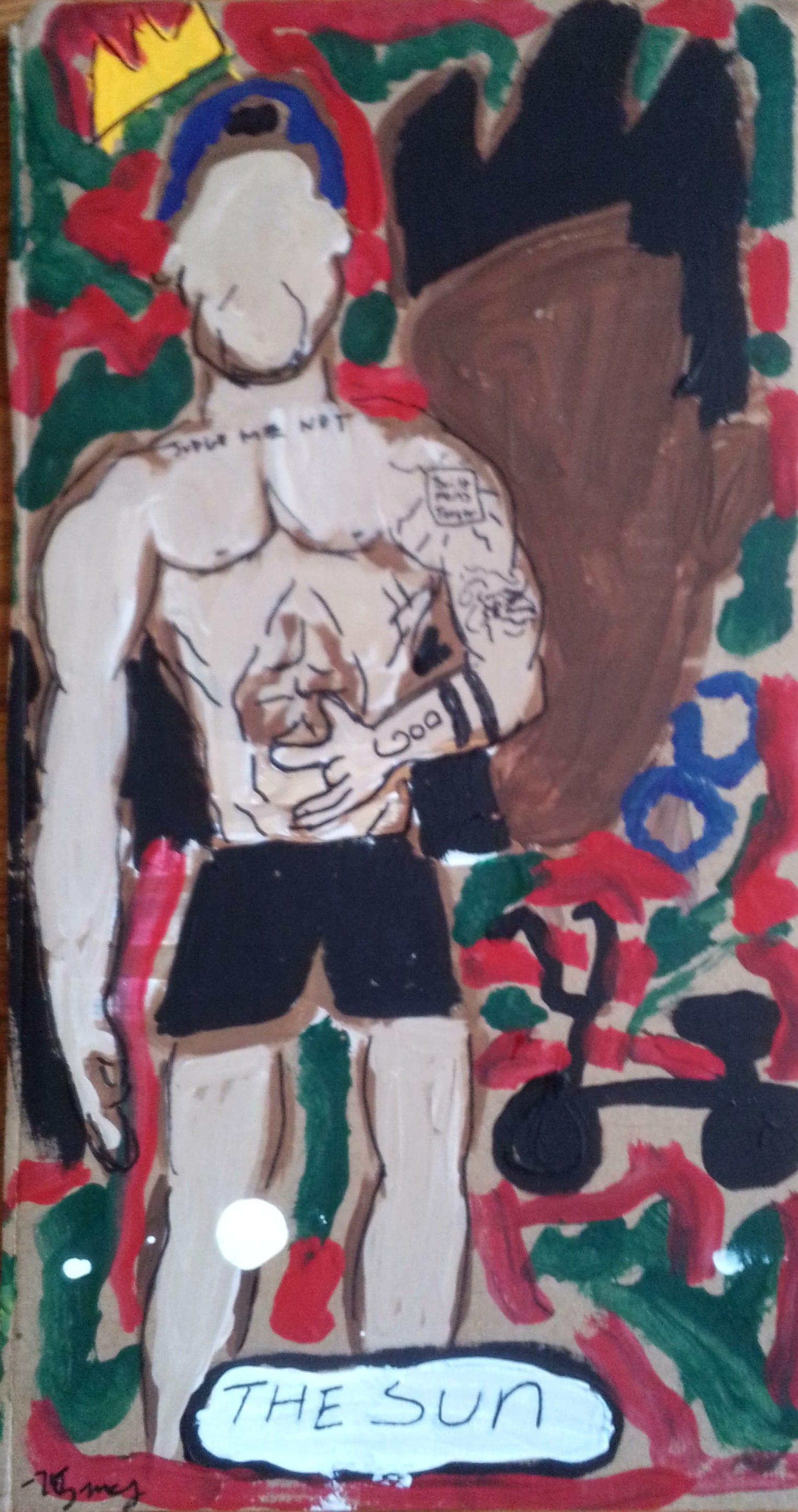 New works are being offered including "Art vs Life," shown above: "A depiction of what creating feels like while simultaneously living feeling life. Painstakingly painted on a U-Haul cardboard to further grieve the loss of my second life's collection."